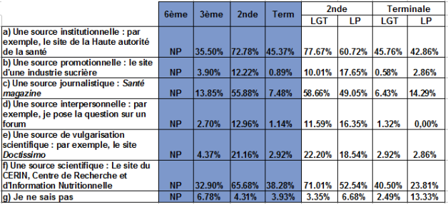 Ainsi, si dans les filières générales et technologiques une sensibilisation à la valeur à accorder aux sources scientifiques commence à se développer, il n'en va pas de même dans les filières professionnelles, où la priorité est peut-être plus accordée aux normes et aux institutions pour un usage plus professionnel que scientifique.