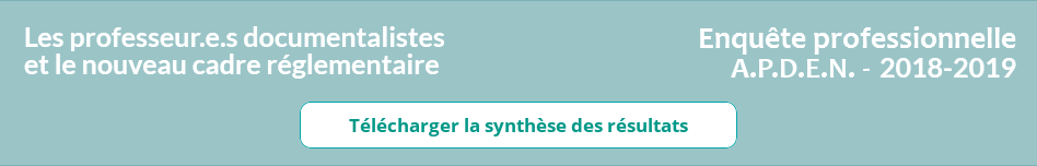 L’A.P.D.E.N. a consulté la profession fin 2018 suite à la refonte intégrale du cadre réglementaire de définition et d’exercice du métier de professeur.e documentaliste. Cette enquête avait pour but de faire le point sur l’évolution des conditions d’exercice, quel que soit le type d’établissement, et plus particulièrement sur la mission enseignante. Elle vient compléter l’analyse menée depuis plusieurs années par l’association pour suivre l’évolution du métier sur le terrain. Cette enquête a été diffusée, via les listes de diffusion professionnelles et aux réseaux sociaux, à un public beaucoup plus large qu’aux seuls adhérents de l’association.