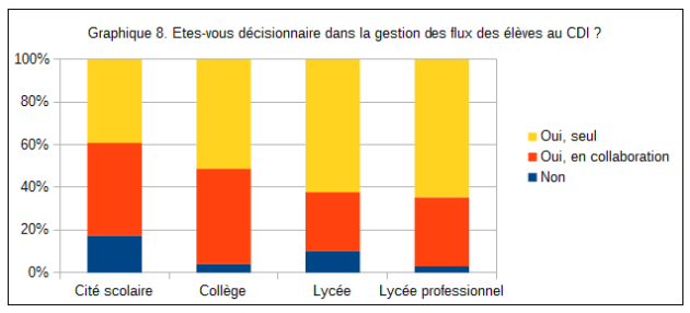 Les professeurs documentalistes sont seuls décisionnaires de la gestion des flux au CDI dans 54 % des cas (747 réponses), contre 49,2 % dans le panel 2014 (Graphique 8). Mais il existe sur ce point un écart important entre le collège (51,3 %), et le lycée GT (62,2 %) ou le lycée professionnel (64,7 %). La gestion des flux s'effectue en collaboration dans 40 % des cas (45 % en 2014), et cette fois-ci plutôt en collège (44,5 %) qu'en lycée GT (27,7 %) ou en lycée professionnel (32,4 %). Enfin, le professeur documentaliste n'est pas du tout décisionnaire en la matière dans 6 % des cas (contre 5,8 % et 8 % dans les panels de 2014 et 2013), la proportion s'avérant plus importante en lycée GT (10,1 %), qu'en collège (4 %) ou en lycée professionnel (2,94 %). Entre 2014 et 2015, c'est la proportion de décisionnaires seuls qui augmente par rapport à la collaboration.