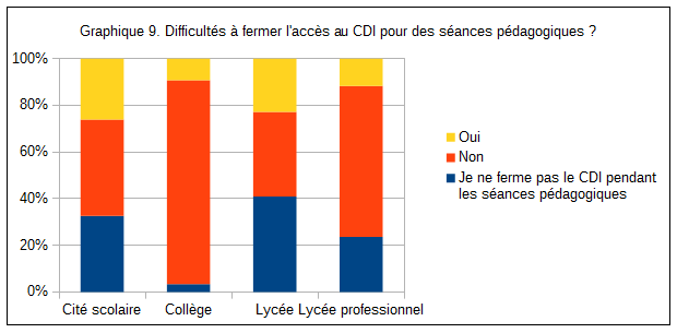 13,3 % des répondants déclarent connaître des difficultés à fermer l'accès au CDI aux autres élèves quand ils organisent des séances pédagogiques (Graphique 9), contre 15,5 % dans le panel 2014. Le fait de ne pas fermer le CDI pendant une séance pédagogique est privilégié en cité scolaire et en lycée GT (dans 32 à 41 % des cas), en lycée professionnel (23,5 %), mais en revanche très rare en collège (3,3 %) où les élèves sont moins autonomes, et où le professeur documentaliste est le plus souvent seul en poste. Dans le cas où le répondant souhaite fermer le CDI pour mener une séance pédagogique, les difficultés déclarées sont moindres en collège (9,3 %) qu'en lycée professionnel (11,8 %), en lycée GT (22,8 %) et en cité scolaire (26,1 %).