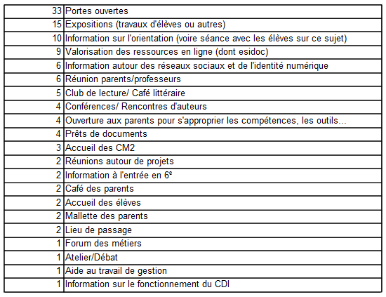 Précisons enfin, au-delà de l'ouverture aux élèves, par le professeur documentaliste et/ou par un AED, la question de l'ouverture et d'actions dédiées aux parents. 12 % des collègues répondants proposent de telles actions, sur 744 réponses. 84 explications sont données (sur 89), avec un récapitulatif dans le Tableau 1.