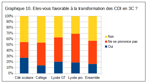 Plutôt favorable aux 3C, une collègue de lycée GT dans l'académie de Rennes, explique ainsi : « Je suis favorable à la transformation des CDI en 3C uniquement en lycée car pour moi, le CDI doit apparaître comme l'antichambre de la bibliothèque universitaire où les étudiants viennent travailler en autonomie. Il est important que les élèves aient un lieu où ils peuvent travailler (recherches, devoirs) et il est important qu'ils se sentent bien dans ce lieu, qu'ils puissent aussi faire des pauses (aller vérifier ses mails ou lire une BD par exemple). A mes yeux, c'est un moyen d'autonomiser et de responsabiliser les élèves et donc une bonne préparation pour le supérieur. Cela ne nous met pas "hors-jeu", nous pouvons accompagner les élèves, nous pouvons les orienter vers les ressources du CDI. Un 3C nous permettrait aussi de faire plus séances et de nous déplacer notamment plus souvent dans les classes car 1 ou 2 surveillants ou aides-documentalistes formés peuvent prendre le relais. »