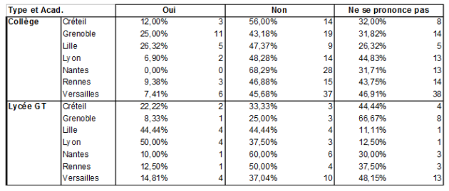 Quelques croisements sont significatifs. D'abord entre académies, si l'on ne retient que les sept académies qui ont fourni le plus de réponses, et en collège seulement, on constate des différences peu surprenantes au regard des échanges existants, avec ainsi une faveur plus importante pour les 3C dans les académies de Lille et Grenoble (25 % ou plus), quand on passe sous les 10 % à Rennes (dans laquelle un grand travail de communication en faveur du développement des 3C a pourtant été effectué par l'Inspection académique), à Versailles et à Lyon, avec une opposition très nette dans l'académie de Nantes (Tableau 2).