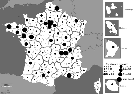 La Carte suivante donne une bonne lisibilité, précisant le nombre de réponses pour chaque département. Cela donne une visibilité sur la pénétration de l'enquête, avec en tête la région parisienne, le Nord-Ouest et les académies de Marseille à Dijon en passant par Lyon.