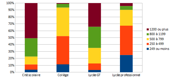 Concernant le nombre d'élèves des établissements représentés, nous avons retenu cinq fourchettes (Graphique 4). Pour ce paramètre, la différence notable entre cités scolaires et lycées GT d'un côté, collèges et lycées professionnels de l'autre, est toujours à prendre en compte. La seule différence avec le panel de 2014 concerne les lycées professionnels, avec un peu moins de grandes structures, au-delà de 800 élèves, dans le panel de 2015.
