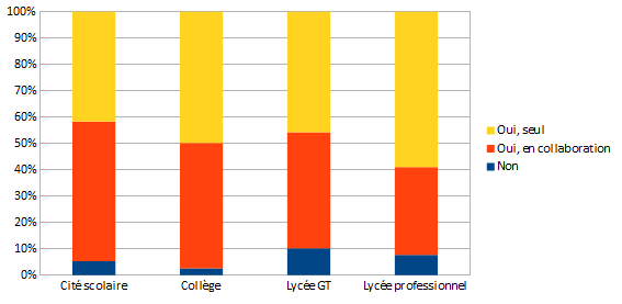 En collège comme en lycée, dans 8,8 % des cas (7,1 % en 2015, 8 % en 2014, 10 % en 2013), il apparaît qu'il n'existe pas d'autre lieu que le CDI pour accueillir les élèves pendant les temps de permanence. Pour le reste, on compte une ou plusieurs salles de permanence dans 74,6 % des collèges, 47,7 % des cités scolaires, 39,6 % des lycées GT, 32,6 % des lycées professionnels, la différence s'opérant ensuite quant à la présence ou non de salles de foyer sans activités organisées. On en trouve ainsi dans 11,2 % des collèges, 35,6 % des cités scolaires, 46,9 % des lycées GT et 50,7 % des lycées professionnels. Pour ces heures de permanence, les foyers avec activités organisées sont peu fréquents, présents dans 5,7 % des établissements concernés par l'enquête (5,8 % en 2015, 5,5 % en 2014, 4 % en 2013).