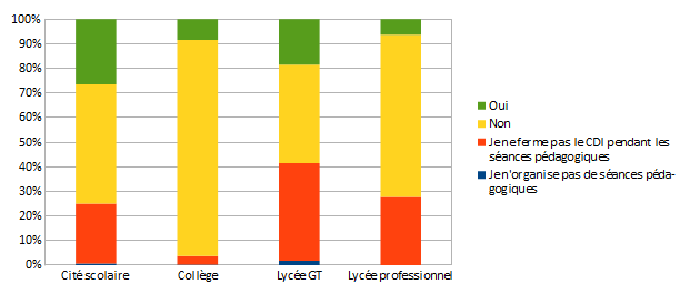 11,5 % des répondants déclarent connaître des difficultés à fermer l'accès au CDI aux autres élèves quand ils organisent des séances pédagogiques (Graphique 6), contre 13,3 % en 2015 et 15,5 % en 2014. Le fait de ne pas fermer le CDI pendant une séance pédagogique est privilégié en cité scolaire et en lycée GT (dans 24,2 à 39,6 % des cas), en lycée professionnel (27,8 %), mais en revanche très rare en collège (3,5 %) où les élèves sont moins autonomes, et où le professeur documentaliste est le plus souvent seul en poste. Dans le cas où le répondant souhaite fermer le CDI pour mener une séance pédagogique, les difficultés déclarées sont moindres en collège (8,4 %) qu'en lycée professionnel (6,3 % contre 11,8 % en 2015), en lycée GT (18,6 %) et en cité scolaire (26,5 %).