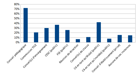21 % des collègues interrogés[3] déclarent s'investir dans la commission TICE, sans que cette instance décolle, donc. Les conseils de classe voient quant à eux la participation de 11,1 % des répondants[4], sans différence entre public et privé, davantage présents en collège (14,2 %), qu'en cité scolaire (8,3 %), lycée professionnel (7,6 %) ou en lycée GT (2,6 %). Le conseil école/collège concerne 44,8 % des collègues de collège public, 10,7 % des collègues de collège privé. Le CVL est investi dans le public par le professeur documentaliste dans 42 % des cas en lycée professionnel, 31,8 % en lycée GT et 20,3 % en cité scolaire (on augmente de 10 points les proportions globales en excluant le privé). Ces deux dernières instances n'apparaissent pas dans le graphique car elles ne concernent pas l'ensemble du panel.