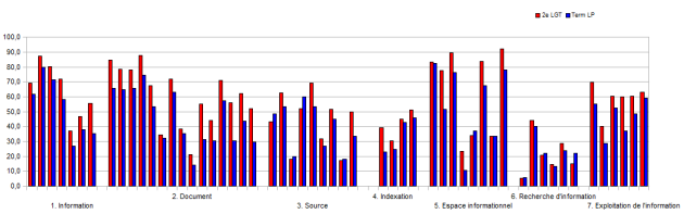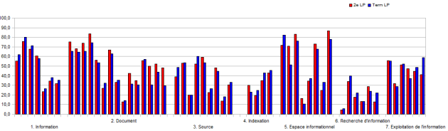 C'est sur les connaissances relatives aux notions organisatrices d'« Espace informationnel » et de « Document » que les écarts sont les plus marqués, avec un différentiel pouvant aller jusqu'à 20 points en défaveur des élèves de Terminale, en ce qui concerne la question portant sur les caractéristiques d'une revue scientifique (Q20, Notion organisatrice : Document).