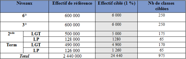 Si le taux de représentativité d'une population de référence est supérieur à 5% dans le supérieur, là où les effectifs sont relativement réduits, il tombe aux alentours de 1% pour le primaire ou le secondaire lorsque cette population se chiffre en millions d'élèves. La présente enquête retient donc ce taux de représentativité de 1%, estimé suffisant dans les enquêtes nationales et internationale (PISA 2009).