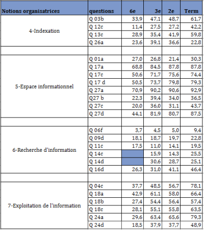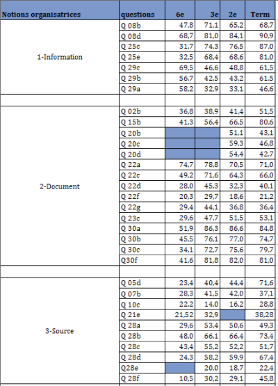 Pour les notions organisatrices "Indexation", "Espace informationnel", "Recherche d'information"et "Exploitation de l'information"