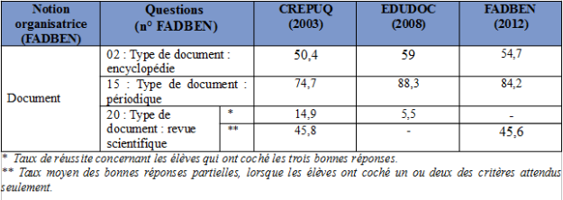 Pour ces trois questions, les résultats de l'enquête FADBEN se montrent équivalents aux enquêtes précédentes, si ce n'est que la France se situe plutôt dans une moyenne, accusant du coup un léger repli du taux de réussite par rapport à l'enquête belge réalisée quelques années plus tôt. Les types de document sont très diversement reconnus dans les trois pays et tout au long de la période considérée.