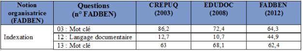 Ainsi en est-il de la compréhension de la notion d'indexation dans toute requête (FADBEN Q 03) où l'on observe une baisse importante et régulière des performances dans la décennie considérée, soit 22 points de moins de 2003 à 2012. Tous ces résultats sont d'ailleurs à juger sévèrement si l'on rejoint le CREPUQ pour penser que les propositions facilitaient beaucoup le choix de la réponse exacte.