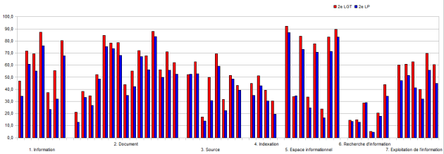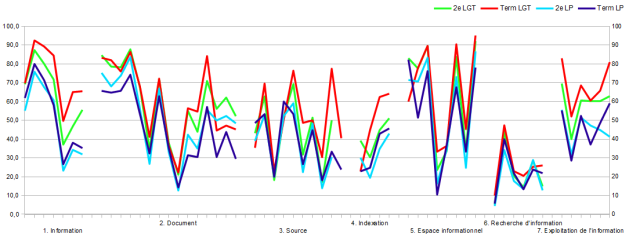 À la question initiale : « Les lycéens de filière générale et technologique et les lycéens de la filière professionnelle ont-ils les mêmes connaissances en information-documentation ? », la réponse semble sans appel : les lycéens des filières générales et technologiques ont un meilleur niveau de connaissances et progressent, tandis que les lycéens de la filière professionnelle ont non seulement un niveau de connaissances moins bon mais, qui plus est, qui tend à s'affaiblir tout au long de leur cursus.
