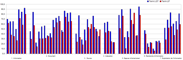 C'est sur les connaissances relatives aux notions organisatrices d'« Espace informationnel » et de « Document » que les écarts sont les plus marqués, avec un différentiel pouvant aller jusqu'à 20 points en défaveur des élèves de Terminale, en ce qui concerne la question portant sur les caractéristiques d'une revue scientifique (Q20, Notion organisatrice : Document).