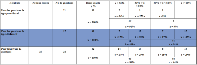 En fin de collège, pour l'ensemble des questions, la majorité des élèves ne réussit que 44% des items. On remarquera cependant que les élèves ont de meilleurs résultats aux questions de type déclaratif (54%) qu'à celles de type procédural (9%). Cependant, ces résultats sont à relativiser car les questions de type déclaratif, les plus nombreuses, sont à choix multiple, offrant donc plus de possibilités de donner une réponse exacte.