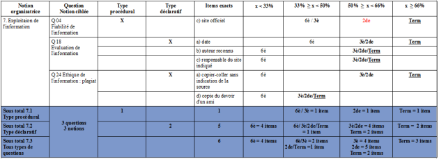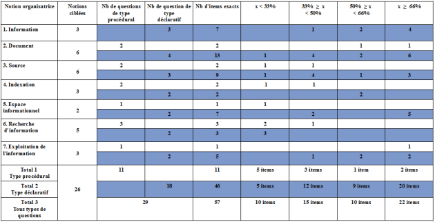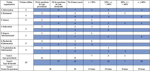 Si l'on constate bien une progression des réussites entre le début et la fin du collège et entre la fin du collège et la fin du lycée, celle-ci n'est cependant pas uniforme. Elle varie en effet selon les notions info-documentaires ciblées. On conclura de cette étude que la majorité des collégiens et même des lycéens n'a que des connaissances très partielles en information-documentation.