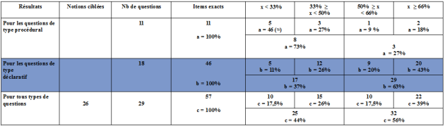 Ce qui nous permet ensuite de donner une photographie par type de question puis, tous types confondus, par tranche de pourcentage d'élèves ayant donné la réponse exacte, ainsi que de part et d'autre du seuil médian pour les élèves de Terminale :