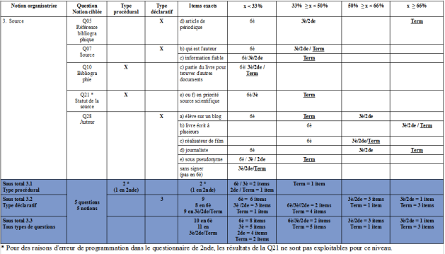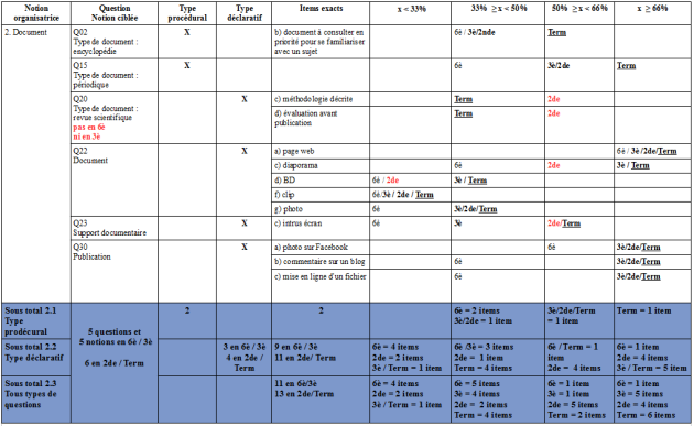 Pour les deux questions de type procédural, portant sur les types de document, les élèves améliorent leurs résultats par rapport à ceux de 6ème, mais ce n'est qu'en fin de lycée qu'ils sont plus de la moitié à répondre de manière exacte à ces deux questions et même à être plus des trois quarts pour l'une d'elles.