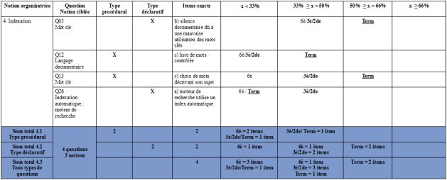 Pour toutes les questions concernant la notion organisatrice « Indexation », les élèves de 2nde se situent exactement dans les mêmes tranches de résultats que les élèves de 3ème. Que les questions soient de type procédural ou de type déclaratif, les résultats sont sous le seuil médian pour tous les niveaux à l'exception, pour les Terminales, des questions portant sur la notion de « Mot-clé ». Mais ce sont ces mêmes Terminales qui ont leur plus mauvais score, à égalité avec les 6ème, à la question portant sur le moteur de recherche.