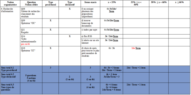 C'est pour les questions de la notion organisatrice « Recherche d'information » que les résultats sont les plus faibles, et de très loin. Les élèves de tous les niveaux sont moins de la moitié à réussir, et même moins d'un tiers, à l'exception des 2nde et Terminales qui se placent un peu mieux pour un des items. Si la pratique de recherche d'information est courante chez la plupart des élèves, elle ne s'appuie, semble-t-il, sur aucune connaissance pour la plupart d'entre eux.