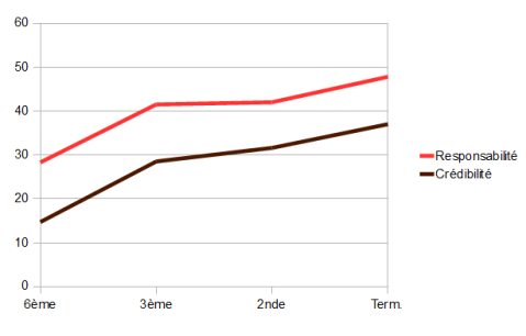 L'écart entre les deux est de 13 points au collège, au profit de la « responsabilité ». Il décroit un peu en lycée pour se situer vers 10,5 points, avec un léger sursaut en Terminale (10,8). Ce sursaut est dû au fait que les Terminales de LGT, à l'inverse de tous les autres publics, font passer la « crédibilité » loin devant la « responsabilité », ainsi que le montre le diagramme suivant :