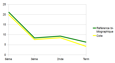 Cette progression s'impose en même temps que la confusion avec les notions de « Référence bibliographique » et de « Cote » s'estompe. Si elle est très forte à l'entrée au collège (41%), où un élève sur cinq balance pour l'une ou l'autre de ces notions, le taux pour cette confusion tombe de plus de la moitié pendant les quatre années du collège et ne concerne plus qu'un élève sur dix à la fin du secondaire. Il faut cependant noter un léger recul, de près de deux points, au niveau 2nde.