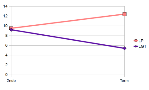 L'appréciation des progrès au niveau du lycée doit cependant prendre en compte les résultats contrastés entre le LP et le LGT, ainsi que le montrent les deux graphiques suivants :