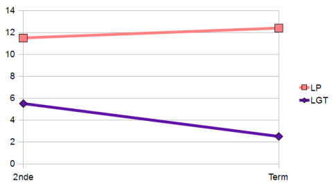 Si les réponses obtenues pour les items « Je ne sais pas » (g) et « [ne sert] à rien » (a) sont cumulées, il ressort que les élèves de LP affichent un taux deux fois supérieur à celui de leurs camarades de LGT pour le niveau 2nde (+6), et que cet écart s'aggrave au niveau Terminale (+10). S'il se résorbe en LGT (-3), il ne fait que s'accentuer en LP (+1).