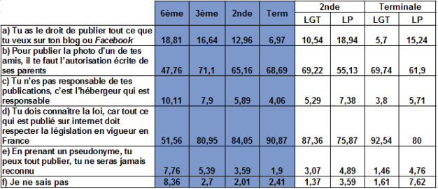 Malgré tout, entre 10% et 18% des élèves, selon le niveau, pensent qu'ils peuvent publier ce qu'ils veulent sur le web. L'expression « ton blog », couramment utilisée, leur donne peut-être l'illusion d'être dans un domaine privé. De même qu'avec Facebook ils pensent rester dans un réseau d'« amis », ce qui est aussi naïf que de penser qu'un mineur n'est pas responsable de ses écrits ou qu'un pseudonyme peut cacher dans tous les cas son identité.