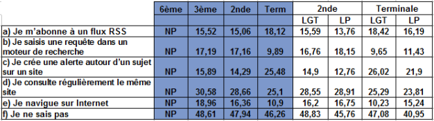 Le principal enseignement à tirer de ces résultats est l'ignorance de la pratique de la veille informationnelle par la plupart des élèves du secondaire. Ils sont déjà presque la moitié à en avoir conscience, les autres faisant preuve de méconnaissance en confondant la veille avec la navigation, la consultation manuelle de sites et la recherche d'information à l'aide d'un moteur. Les élèves de fin de Terminale sont un peu plus nombreux, toutefois, à assimiler la mise en place d'une alerte automatisée à une pratique de veille. Ils restent cependant trois élèves sur quatre à l'ignorer.