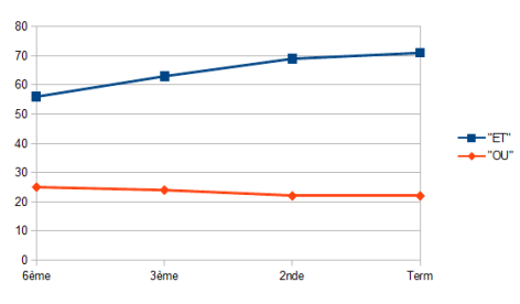 Ainsi, l'opérateur « ET » est plébiscité par une majorité croissante d'élèves avec des scores supérieurs à 50% et allant de 56% en 6ème à 71% en Terminale. Tandis que le choix des réponses comprenant l'opérateur « OU » est fait par une minorité d'élèves avec des scores en légère baisse, de 25% à 22% de l'entrée à la sortie des études secondaires.