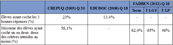 Ce pourcentage correspond toutefois à celui des étudiants ayant coché les trois réponses exactes, a, b et c, ce qui rend la comparaison avec les résultats de l'enquête FADBEN difficile. Pour autant, il est possible de comparer les résultats partiels des enquêtes CREPUQ et FADBEN. Si l'on compare les scores obtenus séparément par les trois réponses exactes a, b ou c, les résultats sont alors sensiblement similaires :