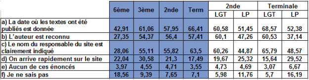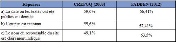 Ne pouvant estimer le véritable taux de réussite de cette question, c'est-à-dire celui qui correspondrait au nombre d'élèves qui ont coché les trois réponses exactes, nous ne pouvons statuer que sur des connaissances partielles portant sur un critère. Ainsi, pris séparément, les résultats peuvent être considérés comme relativement satisfaisants à partir de la 3ème. Mais la comparaison qui suit avec les résultats de l'enquête CREPUQ laisse présager des difficultés à maîtriser l'ensemble des critères d'évaluation de l'information disponible sur le web.