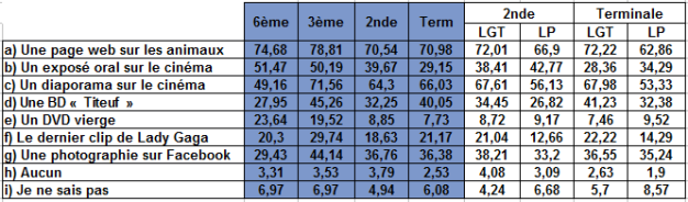 L'exposé oral, réponse erronée, est d'ailleurs assez fortement perçu comme un document : 50% des élèves de collège et 40% des élèves de 2nde (rang 3). Ce n'est qu'en Terminale qu'il descend en rang 4 avec des scores qui baissent à 30%, ce qui représente encore presqu'un élève sur 3.