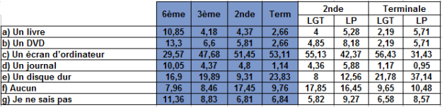 La proposition « Aucun » obtient un score situé entre 8% et 8,6% au collège, mais va jusqu'à dépasser les 17% en 2nde et se situe autour de 10% en Terminale, ce qui place le lycée en moins bonne position que le collège. Ce constat vient renforcer l'impression de mauvaise maîtrise du concept de support documentaire laissée par le score relativement modeste remporté par la réponse exacte. De même, la progression des connaissances stagne plus ou moins et aurait même tendance à baisser, les réponses étant globalement moins performantes en lycée.