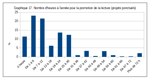 En tout, en termes de promotion de la lecture auprès des élèves, devant les élèves (de manière informelle ou formelle, en club ou en groupe-classe, sur des projets ponctuels ou annualisés), la moyenne est de 4 à 5 heures par semaine. Ces chiffres sont à mettre en écho avec les 6 à 7 heures consacrées aux apprentissages info-documentaires devant groupes-classes.