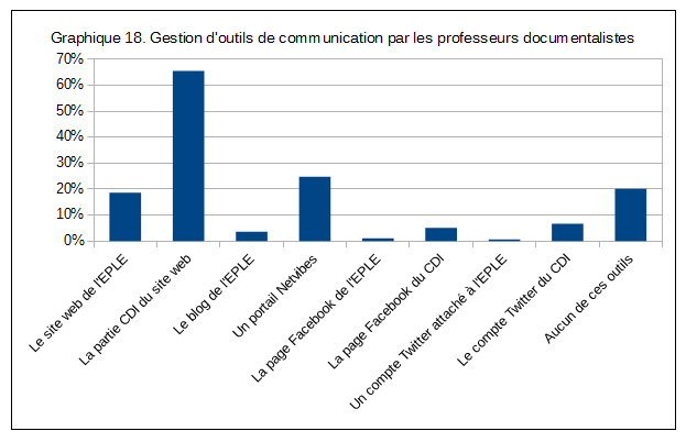 On observe une faible évolution, globalement, de la prise en mains d'outils de communication différenciés par les professeurs documentalistes (Graphique 18). Cela concerne surtout la partie CDI du site web de l'établissement (ou de l'ENT), voire le site web entier, mais on dépasse rarement ce cadre, qui peut rester toutefois le plus pertinent, avec maintien important de portails Netvibes, dont l'ergonomie pose question, mais encore très peu d'investissement dans les réseaux sociaux (à titre non pas personnel, mais pour le CDI). Les plateformes Pearltrees, Symbaloo et Scoop-it sont évoquées, mais de manière très marginale.