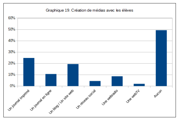 Pour la production avec les élèves, notons d'abord qu'il n'y a aucun média utilisé parmi les six proposés chez la moitié des collègues (693 réponses). Pour le reste, c'est surtout le journal imprimé et le blog ou le site web qui ont la cote, avec un journal en ligne qui s'est finalement peu développé, a contrario de la webradio plutôt utilisée en comparaison de son histoire encore récente et des exigences en matériel et compétences (Graphique 19).