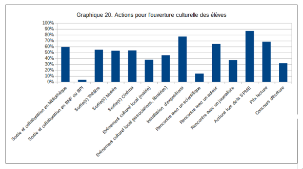 La dernière question de l'enquête interroge la forme que prend le développement de l'ouverture culturelle des élèves, de la part du professeur documentaliste, en se basant sur les trois dernières années d'exercice professionnel. Nous faisons 14 propositions, avec la possibilité de n'en garder aucune, et/ou d'en proposer d'autres. Un seul répondant (sur 692) ne se retrouve dans aucune des propositions. Pour le reste, on observe une diversité d'actions, une faveur importante pour beaucoup d'entre elles (Graphique 20).