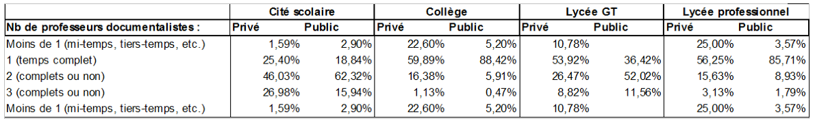 En cité scolaire, ce nombre de postes est très variable selon l'enquête, avec un professeur documentaliste seul ou moins (mi-temps) dans 24,2 % des cas (30,4 % en 2015, 30 % en 2014, 35 % en 2013), 1,5 à 2 dans 54,6 % des cas (67,4 % en 2015, 55 % en 2014, 44 % en 2013) et 3 complets ou non dans 21,2 % des cas (3 dans 21,2 % des en 2015, 15 % en 2014, et 21 % en 2013). Pour les collèges, 91,7 % des répondants déclarent être seuls (94,7 % en 2015, 93,5 % en 2014, 95,6 % en 2013), avec 8,2 % de postes non complets ; ils sont 2 complets ou non dans 7,7 % des cas (5,1 % en 2015, 4,4 % en 2014, 6 % en 2013).