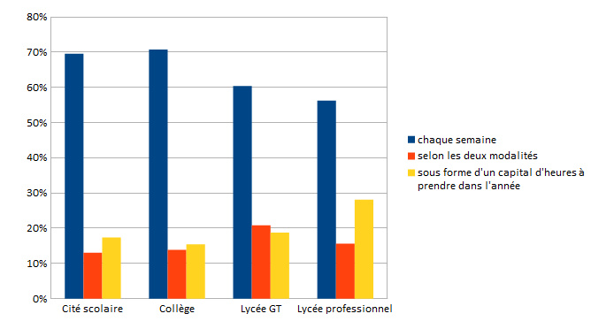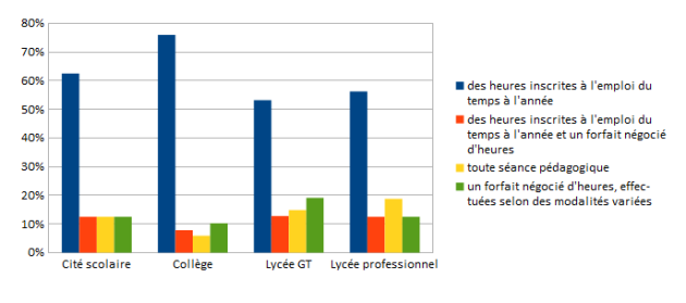 Concernant les modalités, ce sont les heures inscrites à l'emploi du temps de l'année qui l'emportent (70,3 %), avec des différences selon les types d'établissements (Graphique 11), des pourcentages proches pour les autres modalités.