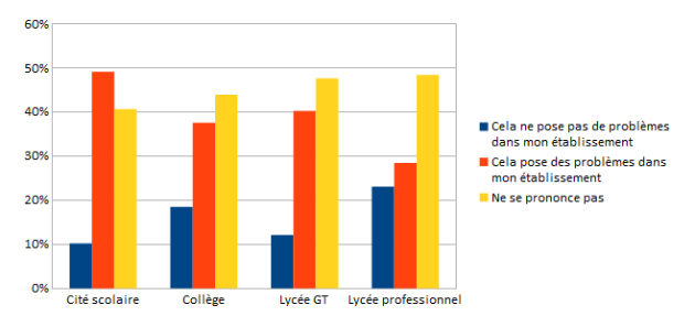 Il apparaît en conclusion que les collègues ont le sentiment que cette application est plus complexe qu'évidente à mettre en œuvre, que cela posera problème dans l'établissement scolaire (Graphique 13). Si 44,8 %, en situation d'attente, ne se prononcent pas, 38,2 % estiment ainsi que cela posera problème, 17,1 % seulement que cela ne posera pas problème.