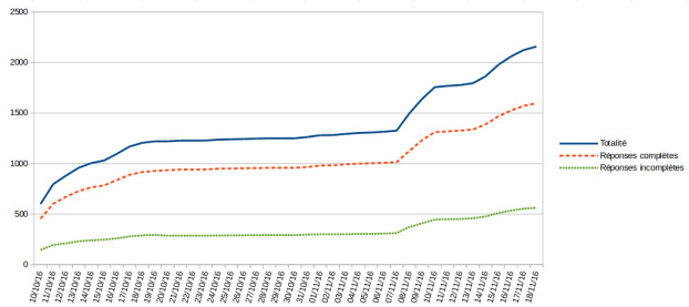 L'enquête était ouverte du 10 octobre au 18 novembre 2016. 2 158 réponses ont été enregistrées, selon la progression illustrée dans le Graphique 1. L'enregistrement des réponses dévoile une croissance initiale, puis des augmentations ponctuelles associées aux relances sur les listes de diffusion professionnelles, sur les réseaux sociaux numériques et parmi les autres cercles possibles, selon les relais effectués par les collègues, notamment après les vacances de la Toussaint. Cela constitue un panel très important, comparativement aux 786, 1 564, 1 107 et 1 861 réponses enregistrées respectivement pour les enquêtes de 2013, 2014, 2015 et 2016[1]. Comme en 2014, il faut noter que la question statutaire mobilise davantage que les questions associées aux axes de mission pédagogique et de gestion.
