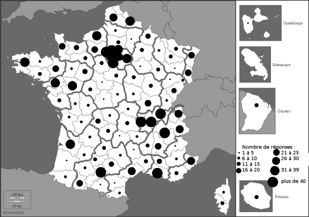 La Carte suivante donne une bonne lisibilité, précisant le nombre de réponses pour chaque département. Cela donne une visibilité sur la pénétration de l'enquête, avec en tête la région parisienne, le Nord-Ouest et les académies de Marseille, Grenoble et Lyon. On observe peu de changements par rapport à l'enquête précédente, si ce n'est dans une inflation du nombre de réponses par département, généralement.