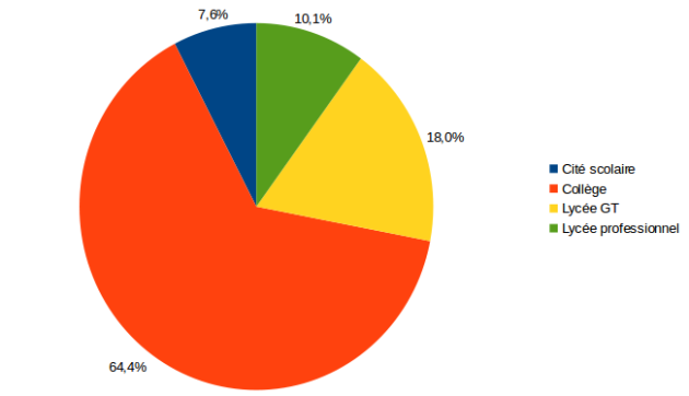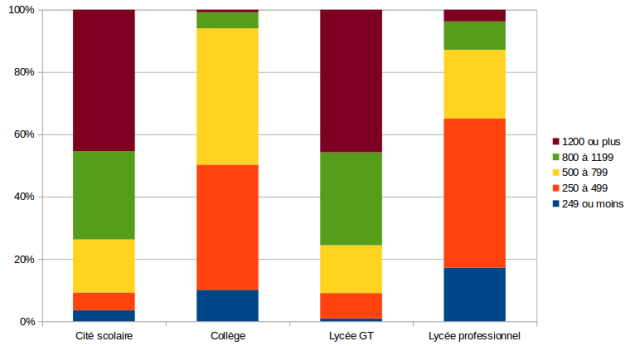 Concernant le nombre d'élèves des établissements représentés, nous avons retenu cinq fourchettes (Graphique 4). Pour ce paramètre, la différence notable entre cités scolaires et lycées GT d'un côté, collèges et lycées professionnels de l'autre, est toujours à prendre en compte.
