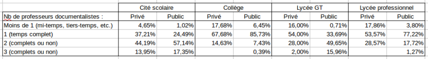 En cité scolaire, ce nombre de postes est très variable selon l'enquête, avec un professeur documentaliste seul ou moins (mi-temps) dans 30,5 % des cas[2], 1,5 à 2 dans 53,2 % des cas[3] et 3 complets ou non dans 16,3 % des cas[4]. Pour les collèges, 91,3 % des répondants[5] déclarent être seuls, avec 8,2 % de postes non complets ; ils sont 2 complets ou non dans 8,4 % des cas[6].