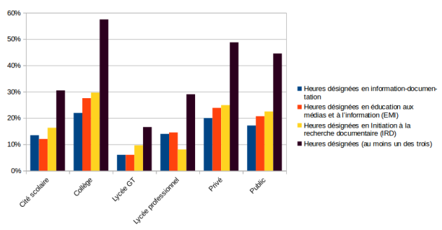 Enfin l'éducation aux médias, forme de parcours en ce qu'elle est considérée comme commune à plusieurs disciplines, concerne environ 60 % des professeurs documentalistes, quel que soit le type d'établissement.