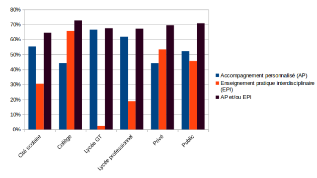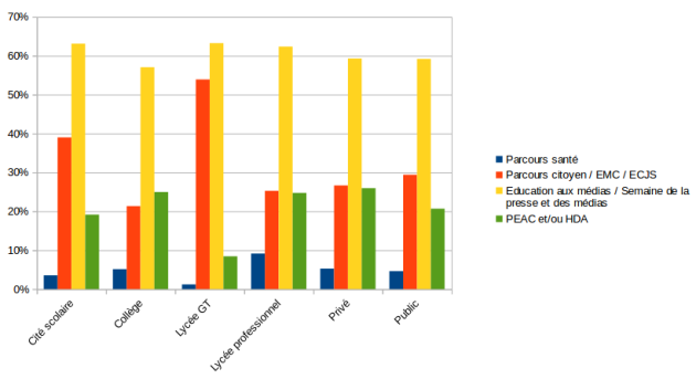 Le Parcours Citoyen est intégré différemment, en particulier dans la participation à l'enseignement moral et civique (EMC) et à l'ECJS, avec une stagnation, malgré une volonté institutionnelle forte, notamment dans l'intégration circonstanciée et superficielle de l'EMI dans l'EMC... En lycée GT, c'est toujours important, avec l'ECJS, pour 53,9 % des collègues[14], avec ensuite 39 % des collègues en cité scolaire[15], également concernés par l'ECJS, puis 25,3 % en lycée professionnel[16], 21,3 seulement en collège[17].