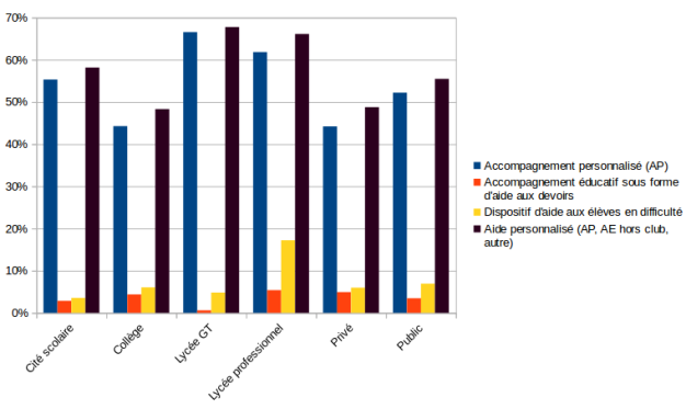 Ainsi pour l'AP cela concerne 44,3 des répondants en collège[2], en augmentation, 61 à 67 % en lycée professionnel et lycée GT[3], en baisse constante. L'écart entre public et privé se réduit largement, à 52,2 % et 42,2 %, contre 40,2 % et 11,9 % en 2016, avec en fait un écart réel pour le lycée GT (70,6 % et 44 %), quand il y a un équilibre par ailleurs. En outre, on voit que l'accompagnement personnalisé remplace finalement l'ensemble des dispositifs existants, si ce n'est en lycée professionnel, notamment l'aide aux devoirs et autres dispositifs d'aide aux élèves en difficulté, même si l'on conçoit que cet accompagnement personnalisé revêt dans la réalité d'autres choses qu'une prise en compte des individualités (Graphique 13). Ainsi l'aide aux devoirs, qui était déjà peu investie par les professeurs documentalistes sous forme de séances formalisées, tend à disparaître. Notons à ce niveau que les activités de médiation, activités pédagogiques informelles avec des élèves qui peuvent en avoir besoin, si elles sont mises en valeur par l'institution dans les projets de circulaire des professeurs documentalistes, ne revêtent pas pour autant la valeur de temps de soutien au même titre que ceux que proposent d'autres enseignants, notamment dans l'aspect financier de la question.